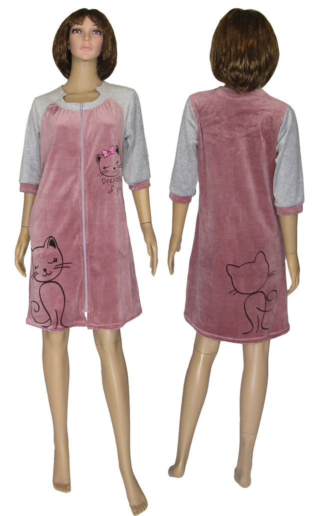Вам подобається оригінальна домашній одяг? Тоді Ви будете зачаровані стильною серією велюрових жіночих халатів Dreaming. Представляємо Вам об'єднані за кольором моделі із забавними принтами у вигляді милих кішечок. Це халати на блискавці, А-силуету, з кишеньками по боках і рукавами "3/4".