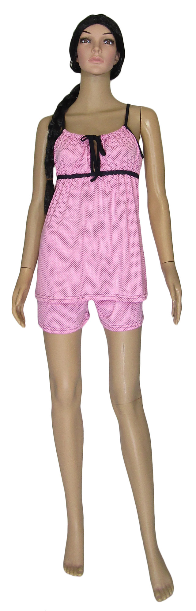 Цей трикотажний комплект виготовлений з бавовни. В набір входить майка на тонких бретелях (топ) і шортики. Тканина дуже приємна до тіла, легка, м'яка, дихаюча. Топ декорований мереживний еластичною гумкою під грудьми і шнурівкою на ліфі. Шорти достатньо вільного, комфортного фасону, на еластичному поясі-резинці.