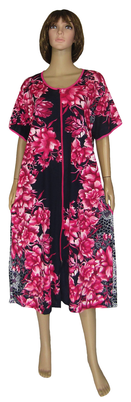 Красиві та практичні жіночі літні трикотажні халати для жінок з пишними формами. Виготовлені з натурального бавовняного полотна, якісно пошиті. Халати цієї серії мають середню довжину нижче коліна (115-120 см за розмірами у серії), короткий рукавчик, кишені з боків. Застібаються на блискавку і зав'язуються по спинці на пояс.