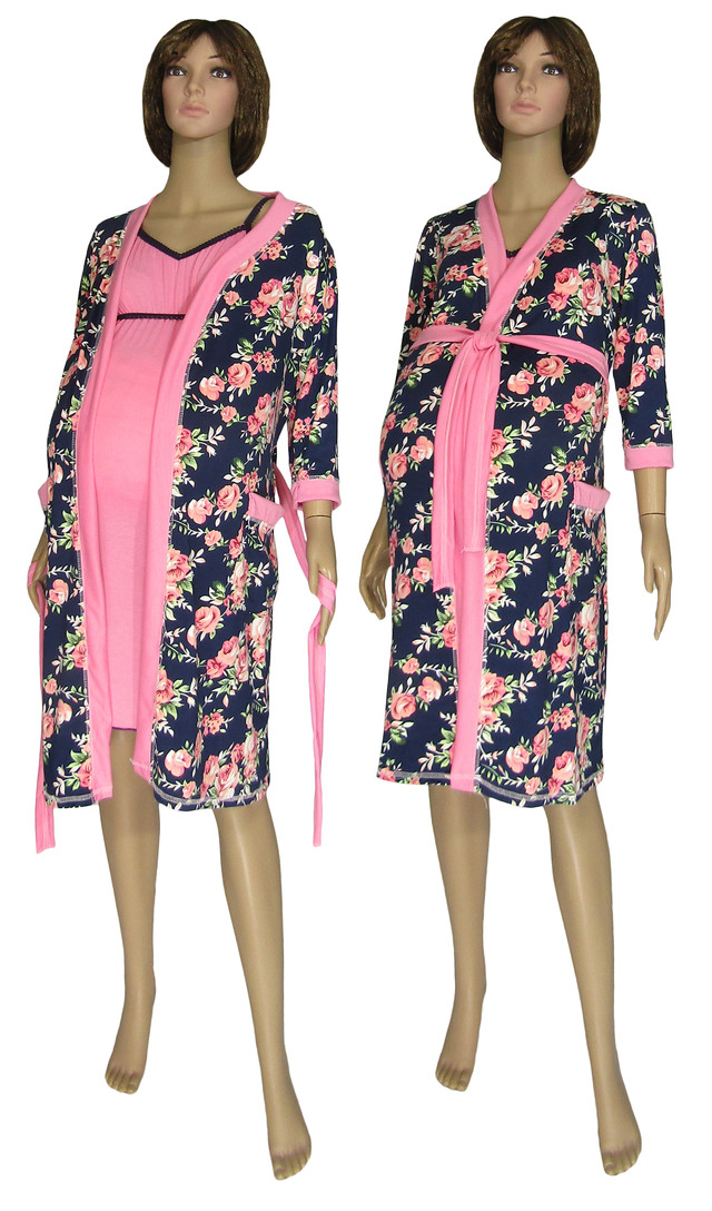 Трикотажна серія комплектів одягу для майбутніх мам (для пологового будинку і будинку) - це двухпредметные набори, що складаються з нічної сорочки і халата. Такі набори Ви зможете носити вдома під час вагітності, а також вони зручні для пологового будинку. Крім того, якщо Ви не любите особливих пристосувань на одязі для годування (крючков, застібок), то Ви можете носити такий комплект і під час годування - еластичні бретелі легко знімаються з плеча, дозволяючи прикласти малюка до грудей.
